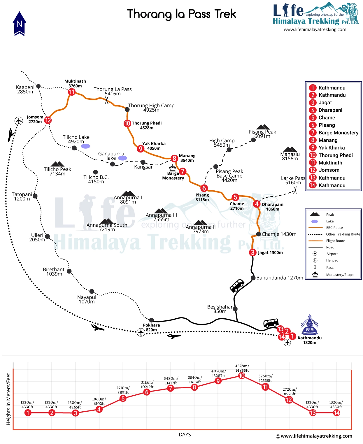 The Thorong La Pass Trek starts from the town of Besishahar and follows the Marshyangdi River Valley. Along the way, you will pass through lush subtropical forests, terraced fields, picturesque villages, and scenic mountain landscapes. The trek also takes you to the world-famous pilgrimage site of Muktinath, which is considered sacred by both Hindus and Buddhists.