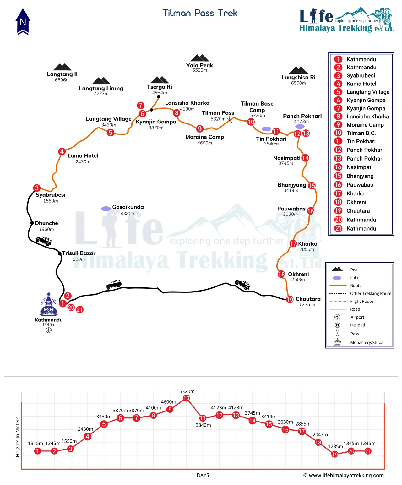 Tilman Pass Trek trail passes through the same trekking trail of the popular Langtang valley trek, but then the trek converts through an extremely remote area with no human habitation for several days on our way to the glaciated area behind the peaks of Urkeinmang (6100m) and Dorje Lakpa (6700m) of the Jugal Himalayan Range.